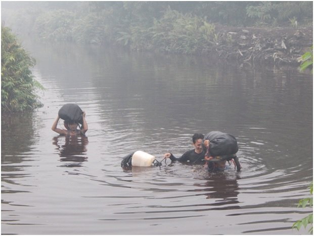 Berenang atau berjalan di sungai dengan ketinggian mencapai leher merupakan bagian dari keseharian di kawasan hutan rawa gambut Semenanjung Kampar, khususnya bagi tim kamera tangkap. Mereka mengapungkan peralatannya dengan menggunakan jerigen plastik, kantong sampah plastik, dan sarung basah yang sudah diisi udara.