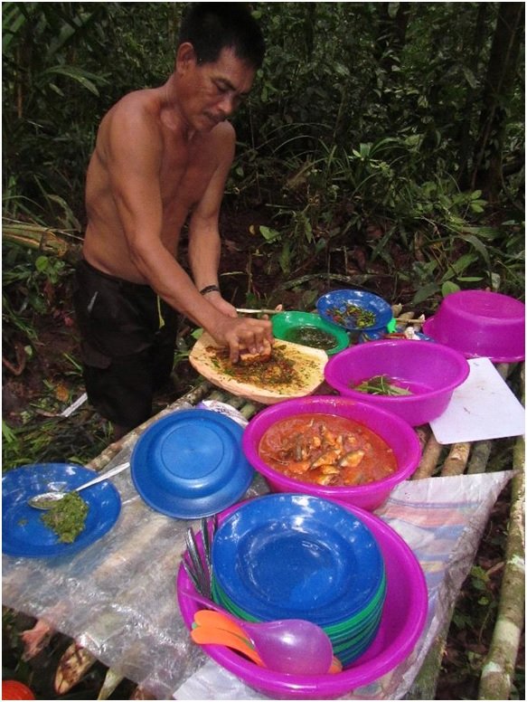 Tim survei kami memasak makanannya sendiri dan anggota tim lainnya membantu mempersiapkan dan membersihkan peralatan makan. Tim kamera tangkap kami selalu berpindah tempat setiap hari, sehingga kemah peristirahatan mereka terbilang sangat sederhana dan mereka memasak dengan menggunakan kompor yang kecil dan ringan berbahan bakar alkohol – yang masih bisa menyala meskipun dalam kondisi hujan (inilah alasan kenapa disebut “hutan hujan”).