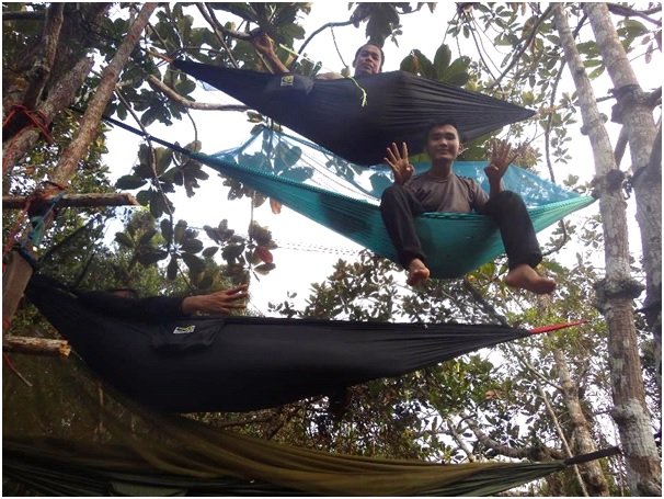 カメラトラップチームは、地面や高台で眠るより簡単で心地よいため、しばしば木の間にハンモックを吊り下げて眠りました。