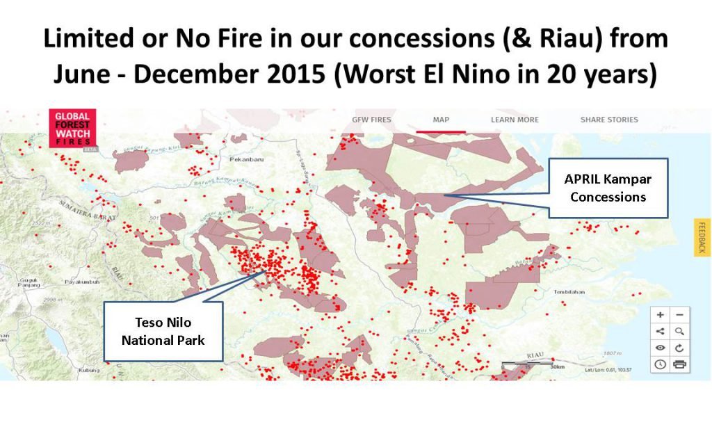エイプリル社の事業活動が2015年火災・煙害危機に直接的に影響したという記事の指摘は、綿密な調査を根拠としたものではありません。実際、エイプリル社の火災防止戦略は、記録に残る最悪の火災シーズン中、地域内の火災件数の大幅低減を実現しました。エイプリル社の「ファイアー・フリー・ヴィレッジ・プログラム(FFVP)」と現行消火能力は、2015年に火災の90%削減を実現しています。火災の殆どは南スマトラやカリマンタンで発生しており、パダン島と近くのカンパール半島ではほぼ火災ゼロとなっています。