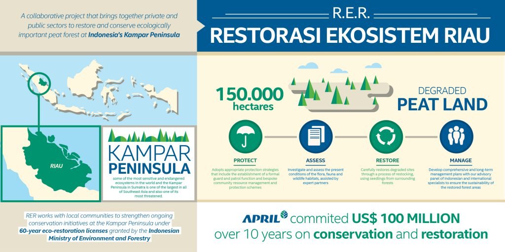 エイプリル社は、国際NGOであるファウナ&フローラ・インターナショナルおよびザ・ネイチャー・コンサーバンシーと共同で泥炭地保護・回復のためのリアウ生態系回復(RER)プロジェクトを進めています。1億USドルを投じたRERプロジェクトでは、カンパール半島の多種多様な生物種の生息する泥炭地林130,000ヘクタールおよびパダン島の20,000ヘクタールについて、評価、識別、保護、および継続的管理が実施されています。