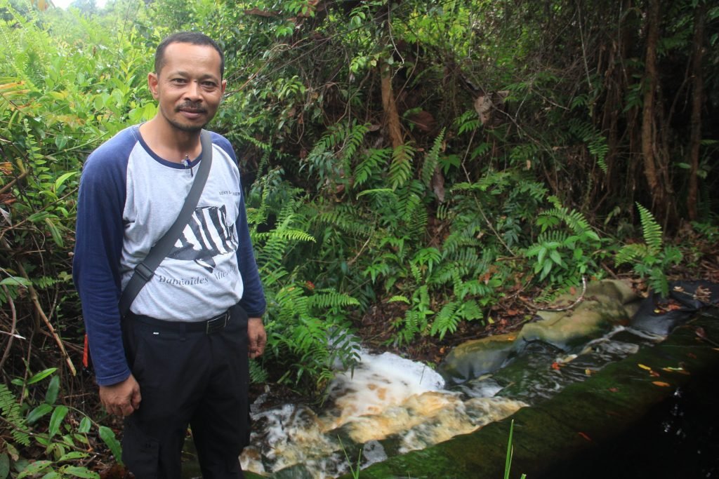 森林保護隊長ロニイ・ラス・シラエン、RER内のサンガーエリアの水路堤防地点にて。堤防は、25~30㎏の砂袋80個を、4人が2日がかりで積み上げて築いた。